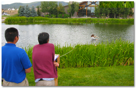 The highlight of this project was having students walk into the murky pond (usually in their oldest trail or wilderness clothing) and use meter sticks to measure the depth to the bottom. Students walked in a straight line heading north and took measurements every 2 meters, then shouted the depth to a friend on shore who recorded the data.