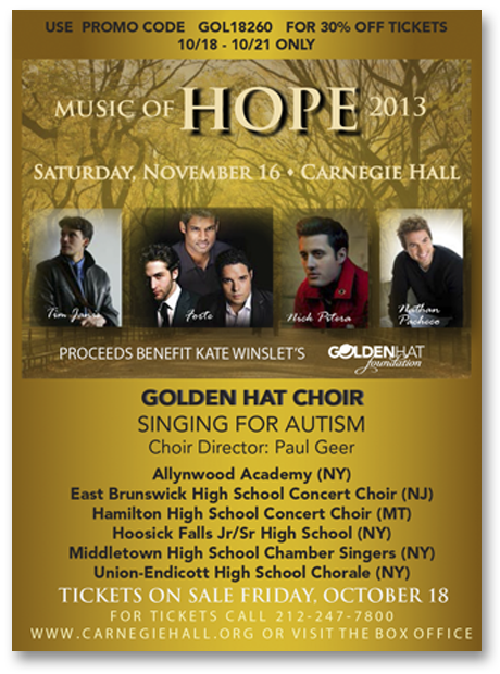 The "Music of Hope" benefit concert will begin at 8:00 p.m. on Saturday, November 16 at Carnegie Hall in New York City. Use the promo code GOL18260 to receive 30% off ticket prices (offer valid 10/18 - 10/21 only). 100% of all ticket sales will go to the Golden Hat Foundation.