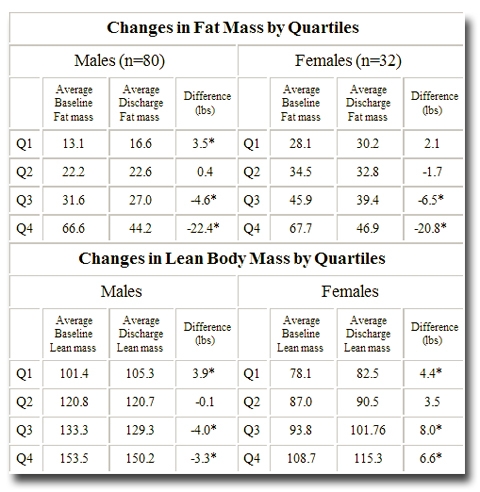 | From Strugglingteens.com Essays By Steven G. Aldana, Ph.D. [Dr. Steven G. Aldana, a professor in the College of Health and Human Performance at Brigham Young University, has published 4 books and over 60 scientific articles on nutrition and exercise. He is currently one of the nation's leading authorities on chronic disease prevention.] Overview Diet, exercise and the related health conditions have been discussed a great deal in Wilderness Treatment Programs. Complaints from participating students suggest that there may be valid concerns regarding the quantity and nutritional quality of the foods provided to program participants. Certainly the validity of these concerns must be addressed, yet it is important to view these complaints in the context that these teens are coming into the program with perhaps the worst diets possible. Any dietary changes from the nutritionally poor fast food/junk food they are accustomed to, would most likely be described as unpleasant. An independent evaluation of the nutritional value of the diet given to students in the RedCliff Ascent Wilderness Program appears to refute any allegations of deprivation. In fact, the results of the evaluation show that the nutritional quality of the food provided to RedCliff participants is much healthier than the foods eaten by the public at large. When combined with a regimen of regular physical activity, the quality of the nutrition given to participants in this wilderness program represents an intervention that can prevent cardiovascular disease, and most cancers. This report summarizes the results of the independent evaluation. The diet of RedCliff Ascent Wilderness Program student participants was analyzed in terms of its nutritional value, quantity and its effect on the body while they were hiking in the wilderness. From March, 2002 to January 2003, 112 youth with complete sets of data, including a baseline and a discharge physical exam, graduated from the wilderness program. Of the 112 participants in this data set, 80 were male, 32 were female and the average time spent in the wilderness was 59 days. During the physical examination, resting heart rate, body composition, height, and weight were ascertained. Fat mass and lean mass in the participants was estimated using the Tanita Electrical Impedance Scale. Fat mass, a calculated estimate of the total amount of fat a participant has, is measured in pounds. Lean body mass is by definition everything else but fat mass. For example, a person who weighs 150 pounds could have 50 pounds of fat (fat mass) and 100 pounds of muscle, bone, skin, connective tissue etc. (lean mass). Measurements of weight and body mass index were also taken but were not used because they can mask changes in muscle and fat tissue. If deprivation is occurring it will likely occur to all participants, even those who have sufficient fat stores to tolerate long-term caloric deficits. Results For this analysis, individual baseline measures of both fat and lean mass were ranked from the lowest to highest amounts and were categorized into equal fourths, or quartiles. These quartiles are represented by Q1-Q4 and can be seen in Table 1. Baseline quartiles were calculated separately for males and females for fat and lean mass. The top half of the table shows changes in fat mass for males and females. For example, the line that starts with Q1 on the male half of the table represents the lowest 25% of fat mass scores for males at baseline. Visually, these teens would appear to be very lean with little visible body fat. The average fat mass for this group was 13.1 lbs and after an average of 59 days in the program they had 16.6 pounds of fat at discharge, a gain of 3.5 pounds of fat. Line Q4 of the same section of the table shows the quartile with the highest amount of fat at baseline. This group of boys started with an average of 66.6 pounds of fat and lost 22.4 pounds of fat at discharge. Paired t-tests and a Repeated Measures ANOVA statistical test were used to determine whether differences in fat and lean mass were significant; if so, they were marked in the table with an asterisk. Both males and females who had low levels of body fat at baseline actually gained fat by the end of the program, which is demonstrated in Table 1. Those with approximately average levels of fat at baseline, represented in Q2, didn't change much. Those who entered the program with elevated levels of baseline body fat, those in Q3 and Q4, lost significant amounts of body fat. Changes in lean mass or muscle are also dependent upon baseline levels of muscle mass, as is the case with fat mass. All the females (Q1-Q4) gained muscle mass. Only the boys with the least amount of muscle tissue at baseline (Q1) gained additional muscle. For the boys with the highest amount of muscle (Q3,Q4), there was a small, but significant decrease in muscle mass. Discussion These changes in body composition are considered to be favorable, and are the result of adequate and wholesome nutrition and regular vigorous physical activity. To verify this assumption, additional nutrition and physical activity data were gathered. RedCliff staff provided detailed information about the foods each participant received. The nutritional composition of each participant was analyzed using the Nutrition Analysis Tool 2.0. On average, each participant received enough food to provide him or her with 3,137 calories per day. The composition of the calories was: 18% protein, 33% fat, consisting of 11.8% saturated fat, and 49% carbohydrates, of which less than 5% was from simple sugars. Each participant received approximately 5.5 servings of fruits and/or vegetables each day and as much water as desired. The diet also included ample servings of nuts, whole grains, beans, and lean meats. The overall content of the food was recommended by Dr. Walter Willett, Chair of the Department of Nutrition at Harvard University. Many of these Eat, Drink, and Be Healthy. The energy expe